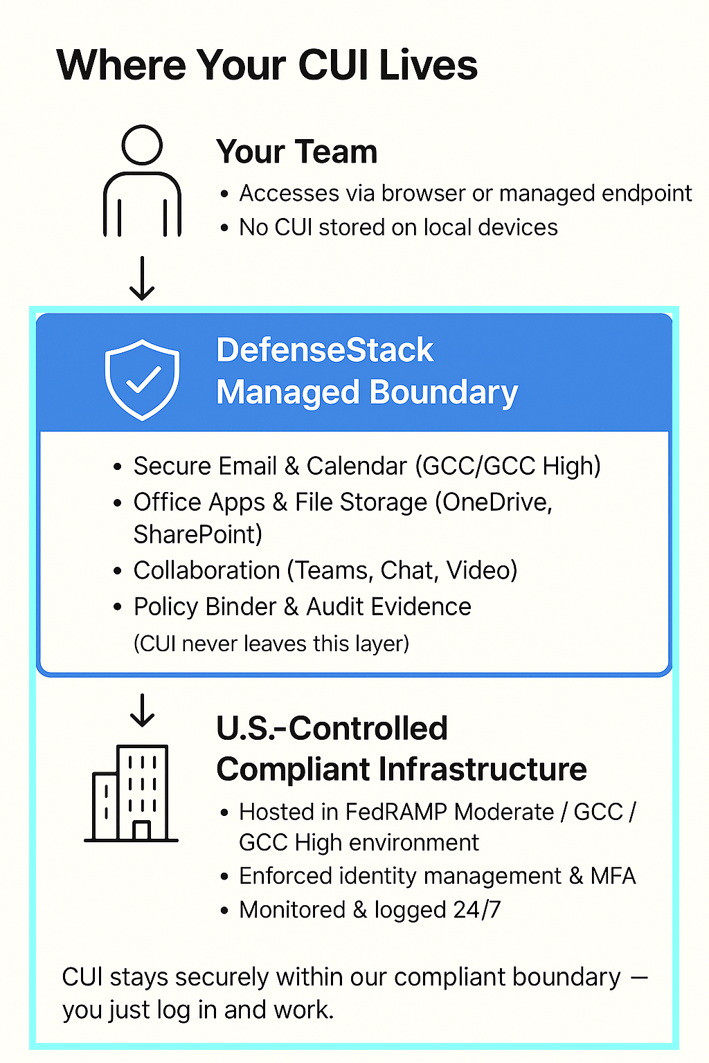DefenseStack is a fully‑managed, CMMC Level‑2–ready platform that securely hosts your Controlled Unclassified Information (CUI) inside our certified boundary.